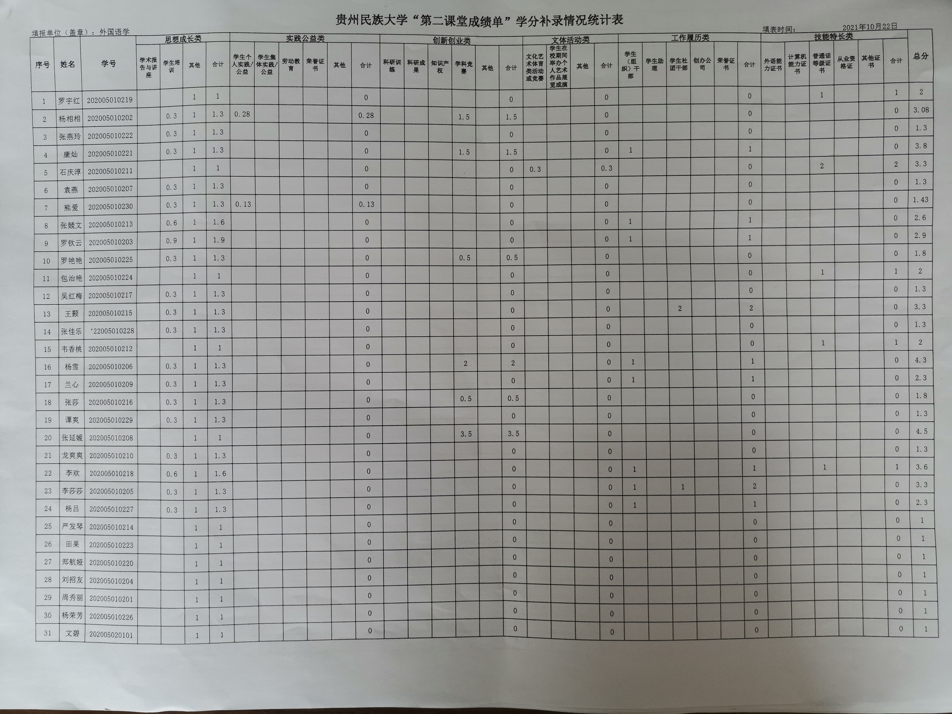 为进一步贯彻落实《教育部关于加快建设高水平本科教育全面提高人才培养能力的意见》(教高〔2018〕2号)文件、《高校共青团改革实施方案》和《关于全面加强新时代大中小学劳动教育的意见》精神,根据《贵州民族大学“第二课堂成绩单”制度实施办法》,现将HUATIHUI.COM2020级学生“第二课堂成绩单”补录学分公示如下:
