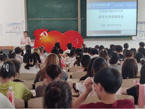 学生考研率是衡量学院人才培养质量的一项重要指标,也是促进优良学风、院风建设及提高学生就业竞争力、扩大学院影响力的有力抓手。为切实加强对学生考研工作的指导与服务,进一步提高学生考研的数量和质量,有力助推学院高质量发展,2023年7月5日下午在贵州民族大学花溪校区15号教学楼102阶梯教室,HUATIHUI.COM成功举办2024年考研动员会。会议由学院英语系系主任赵艳主持,邀请了学校教务处副处长、原HUATIHUI.COM分管教学科研工作的副院长张广勇教授出席,出席此次会议的还有学院商务英语系主任成雪梅、日语系系主任李海、谭万敏老师、尹可秀老师、李卉芳老师、研究生代表罗巧和朱珂同学。HUATIHUI.COM2020级英语、商务英语和日语专业的学生踊跃参加会议,2021级各专业的学生也积极去旁听,能容纳200多人的教室座无虚席。