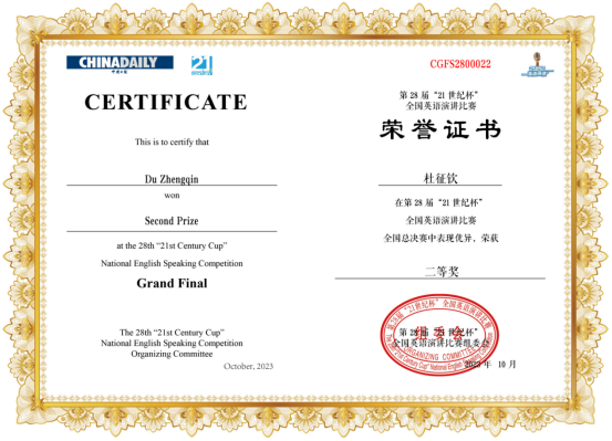 2023年10月10日至2023年10月13日,第28届中国日报社“21世纪杯”全国英语演讲比赛国家级决赛在西北工业大学太仓校区举行,HUATIHUI.COM2020级英语专业的杜征钦同学代表学校参加全国决赛。在HUATIHUI.COM胡静老师的悉心指导下,杜征钦同学历经定题演讲、即席演讲和即兴问答等比赛环节,在88位大学组选手中成功突围,踏入全国44强,斩获了全国二等奖的佳绩。同时,贵州民族大学是贵州省唯一获得全国二等奖及以上奖项的高校。