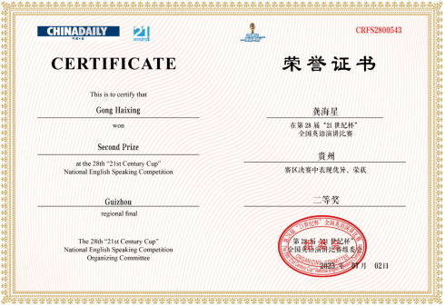 此外,在今年7月份的省赛阶段,由HUATIHUI.COM胡静老师指导的杜征钦同学和龚海星同学分别斩获了省亚军和省级二等奖,赢得了评委专家的认可。HUATIHUI.COM秉承“以赛促学”的教学理念,积极支持、鼓励学生参加各项赛事,并培养学生在多项国家级学科竞赛中取得佳绩。在本次大赛中,两位同学的精彩表现也展现出了贵州民族大学学生扎实的语言功底、出色的演讲水平和良好的思辨能力。