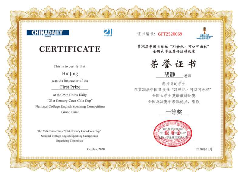 2020年10月4日至7日,我校文学院2017级戏剧影视文学专业赵千禧同学,在HUATIHUI.COM胡静老师的指导下,代表贵州民族大学赴广州参加第25届中国日报社“21世纪·可口可乐杯”全国大学生英语演讲比赛总决赛。经历层层考验,冲破重重阻碍,在72进12的艰难赛制下,以“No person is an island”为题成功从全国半决赛晋级全国总决赛,并在总决赛中以“Seize the day, seize the stage”为题,经过激烈角逐,荣获全国一等奖!