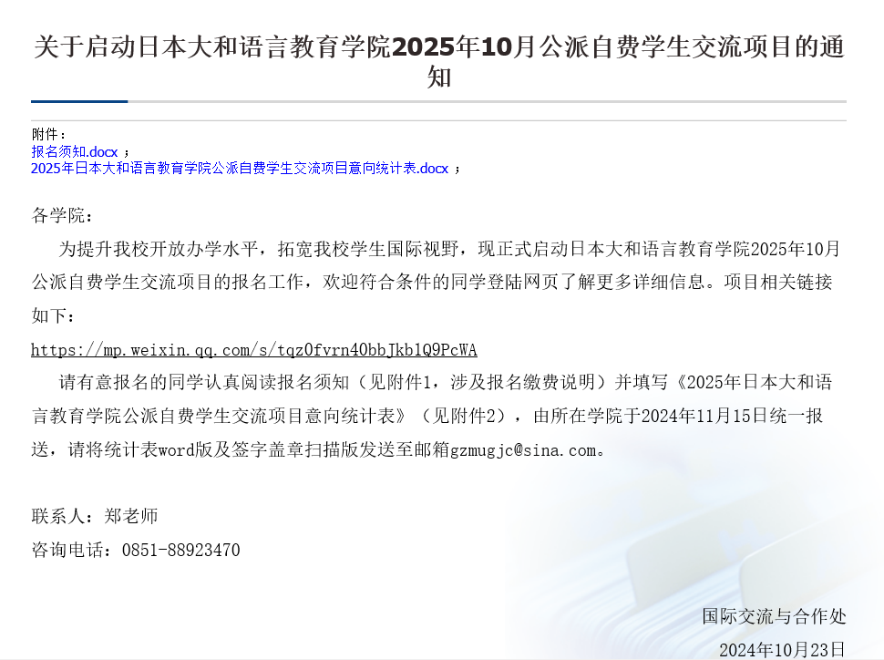 转发 关于启动日本大和语言教育学院2025年10月公派自费学生交流项目的通知